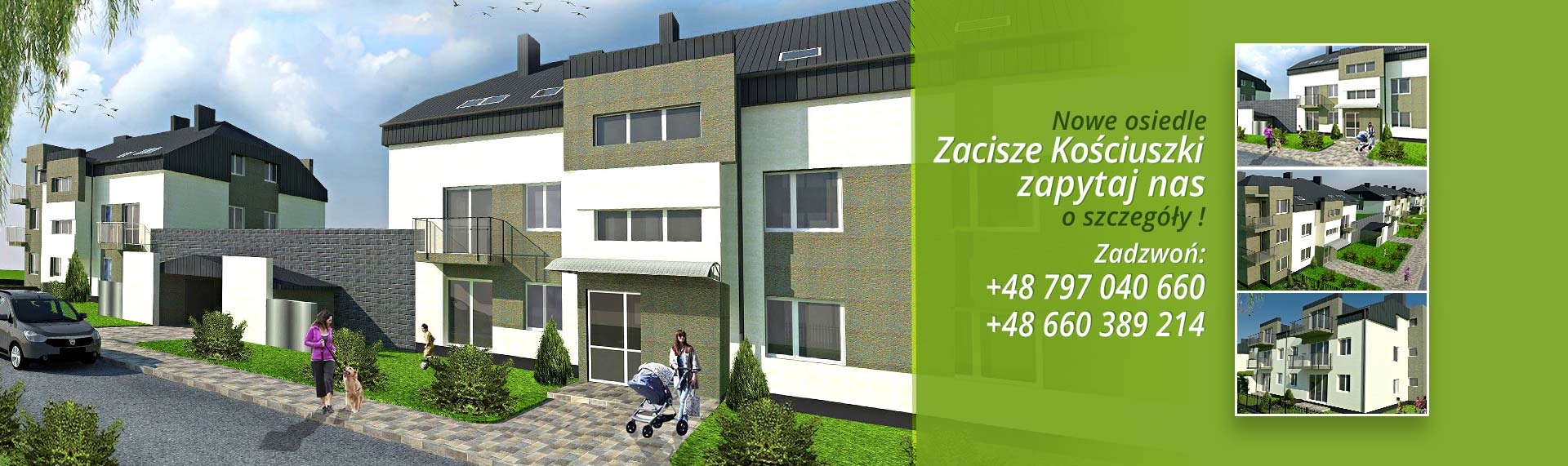 Nowe Osiedle Zacisze Kościuszki  tworzy przyjazny klimat dzięki niskiej, kameralnej zabudowie, wprowadzając tym samym w rodzinną i spokojną atmosferę tego miejsca. Inwestycje wyróżnia nowoczesna architektura i przyjazne zagospodarowanie terenu osiedla: przewidziano garaż naziemny i miejsca postojowe na zewnątrz oraz strefę rekreacyjną przynależną do nowego osiedla. Cała inwestycja zostanie wykończona, z dbałością o detale: alejki z kostki brukowej i zielenią.