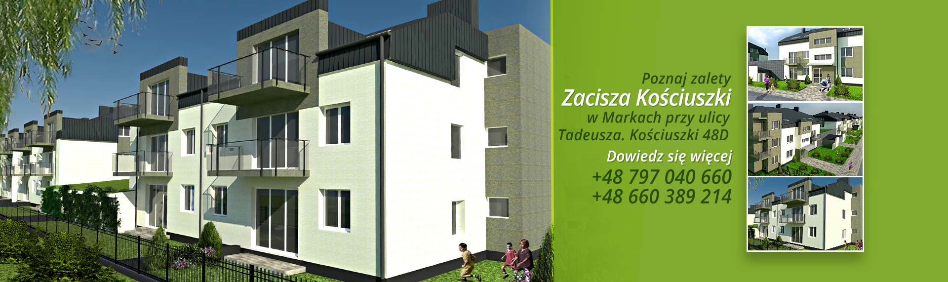 W nowej inwestycji w Markach zaplanowano 48 mieszkań o metrażach różnej wielkości, wszystkie z nich posiada balkon lub ogródek.  Dodatkowo zapewniamy szeroki wachlarz najbardziej funkcjonalnych rozkładów mieszkań. Nowe mieszkania mają już od 31 m2 do 90m2. Nasze nowe Osiedle Zacisze Kościuszki stanowi 6 budynków wielorodzinnych o niskiej zabudowie po 8 nowych mieszkań w każdym.